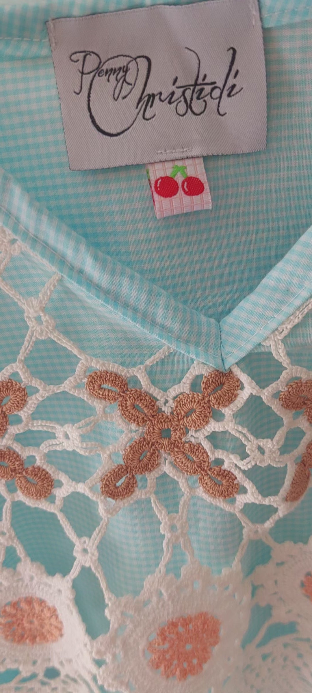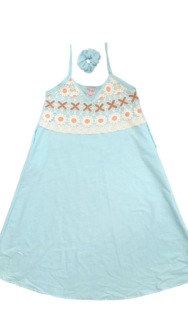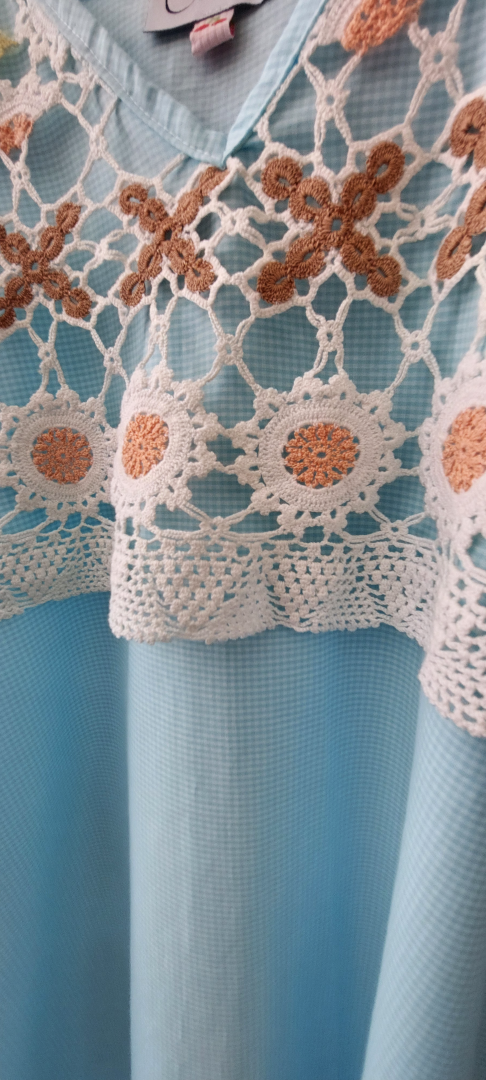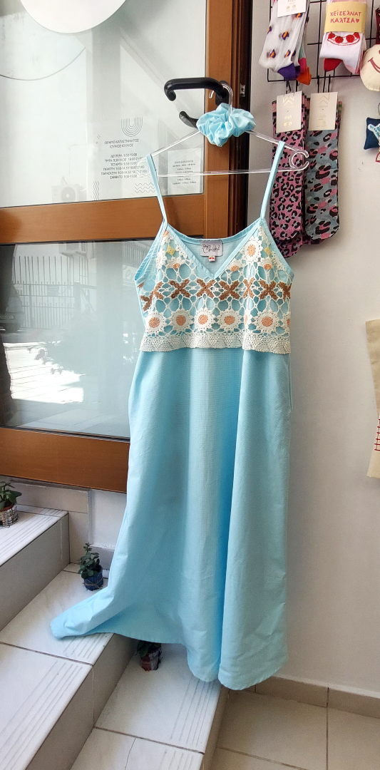 Μακρύ φόρεμα με τσέπες. Λεπτομέρεια στο στήθος από κεντητό βελωνάκι. Με υπέροχη κίνηση.