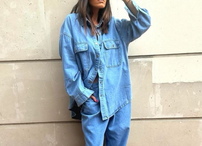 Πουκάμισο μπλε ανοιχτό τζιν μαλακό με τσέπες μπροστά και κουμπιά. Φαρδύ. Καλύπτει περιφέρεια στήθους έως 1,28μ