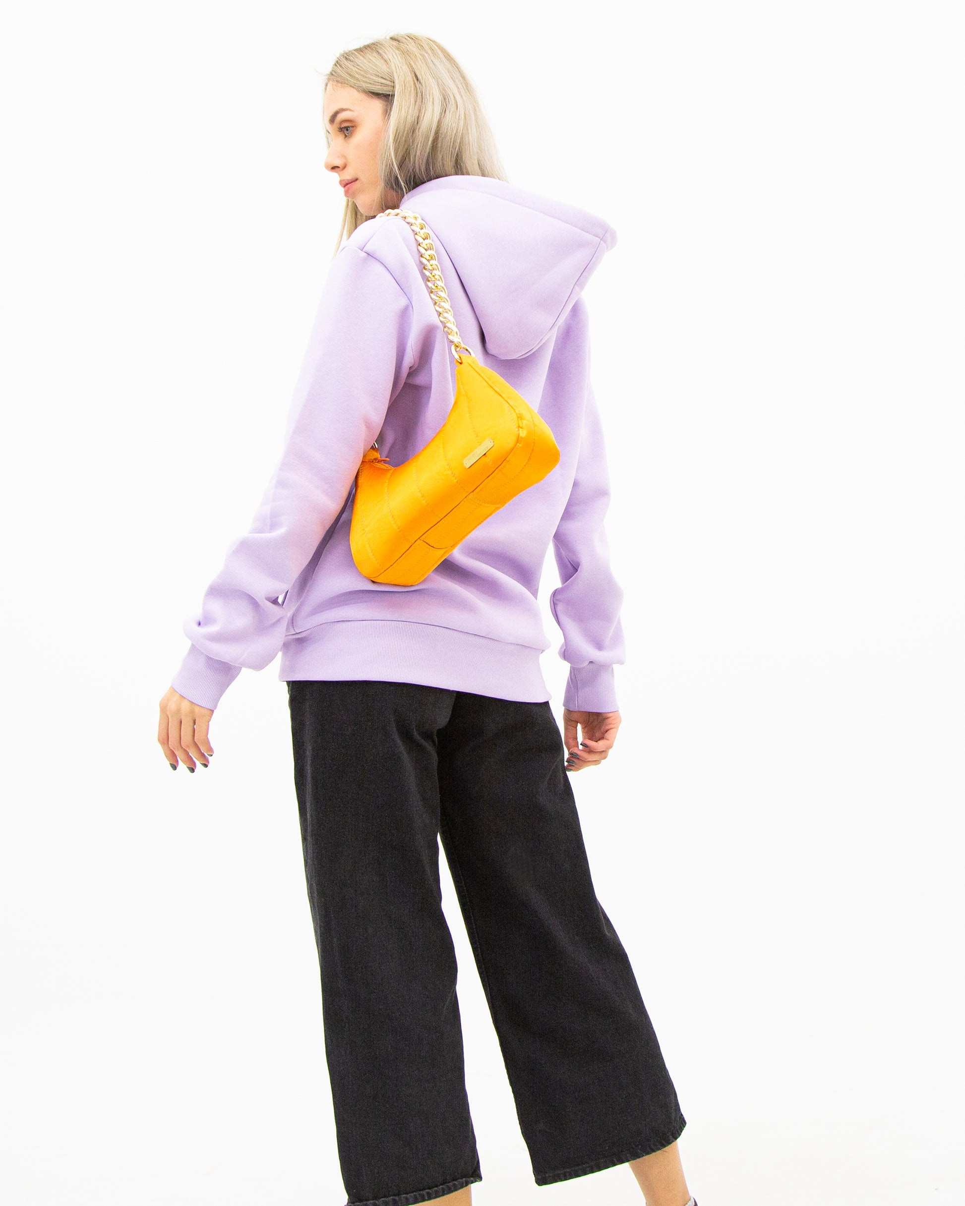 Πορτοκαλί παιχνιδιάρα mini baguette bag. Κλείνει με φερμουάρ.