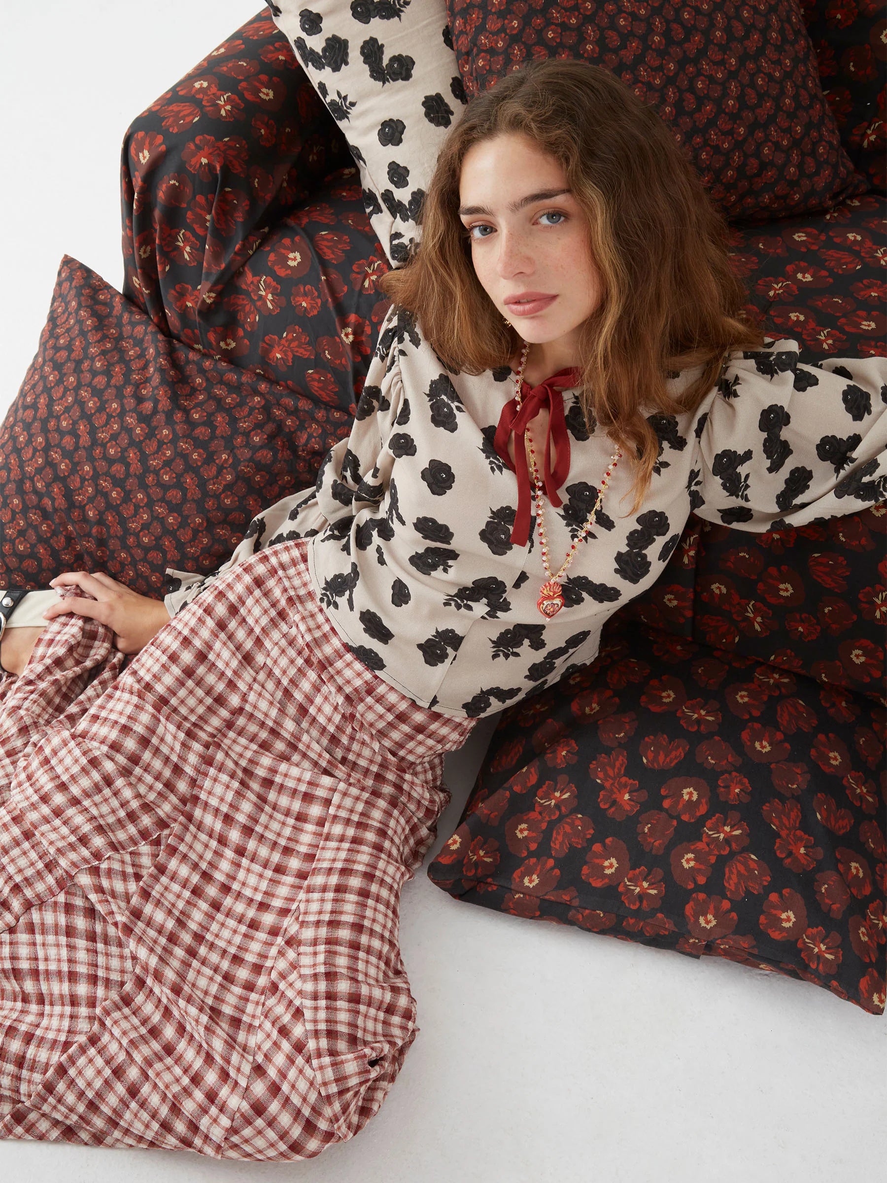 Μπλούζα με φλοράλ τύπωμα και μακριά μανίκια. Λεπτομέρεια με σούρες και λάστιχο στα μανίκια και στις μανσέτες. Κλείσιμο με δέσιμο μπροστά.