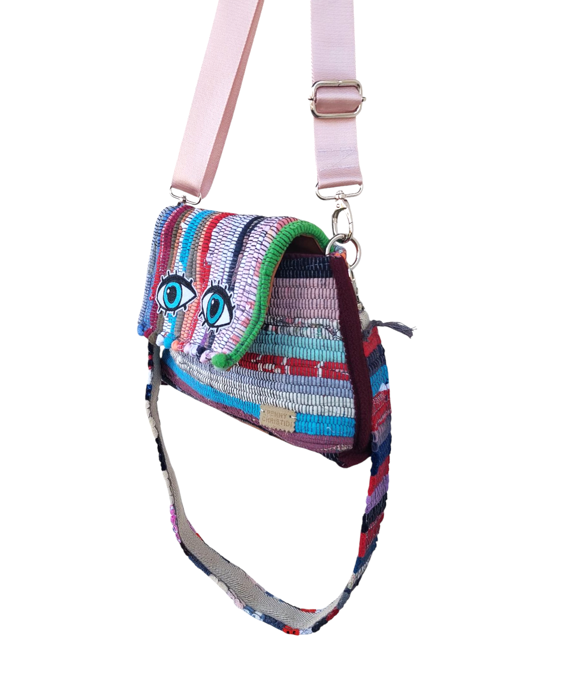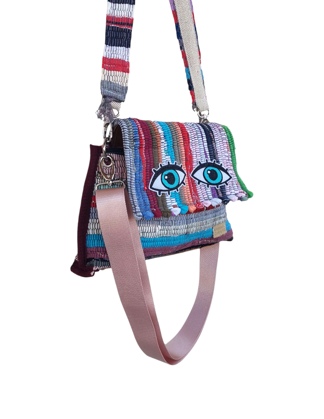 Mini τσάντα κουρελού με δύο ιμάντες. Έχει λεπτομέρειες από patch μάτια και δερματίνη.