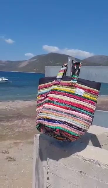 Κάθε τσάντα είναι χειροποίητη και μοναδική και είναι κατασκευασμένη από κουρέλου. Αυτό κάνει κάθε τσάντα μοναδική και μπορεί να έχει διαφορές χρώματος από τις φωτογραφίες.